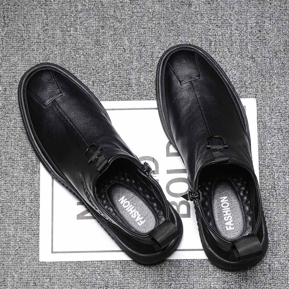 Men's Round Toe British Mens Leather Boots Side Zipper Martin Boots Wear-Resistant Low-Heel Shoes